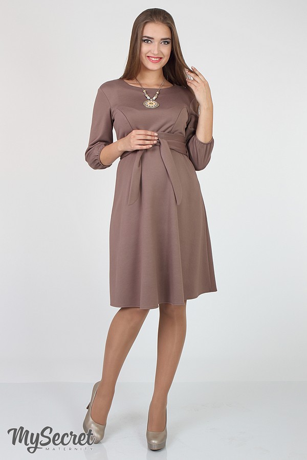 Очень женственное платье из трикотажа джерси, с возможностью кормления (секрет - потайные молнии в нагрудных рельефах). Спущенное плечо, пышный рукав 3/4, юбка-полусолнце и пояс-кушак - интересные детали фасона при сдержанной цветовой гамме создают элегантный, классический образ. Цвет: капучино.
