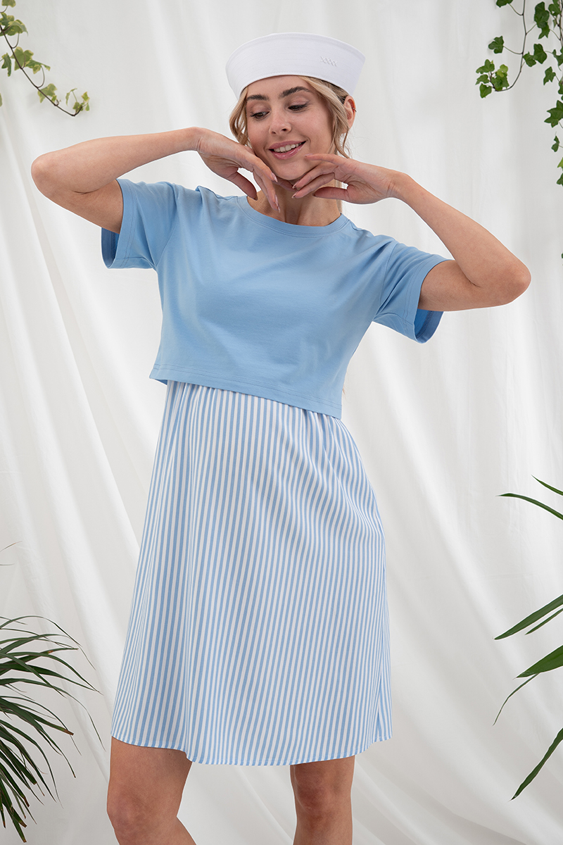 Сукня для вагітних та годуючих, що складається з трикотажнго топу поверх сарафана з легкою спідницею.