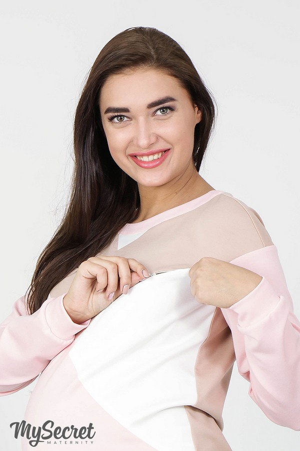 ХИТ СЕЗОНА! Ультрамодный костюм для беременных и кормящих в стиле casual из трикотажа джерси на все случаи жизни. Свитшот в стиле color-block выполненный в трёх цветах так и притягивает взгляд, а секреты для кормления очень удачно замаскировались в нагрудных рельефах (незаметные потайные молнии). Контрастные лампасы на брюках визуально стройнят фигуру, а широкая резинка на поясе не будет сдавливать растущий животик. Цвет нюд-молоко-пудра.