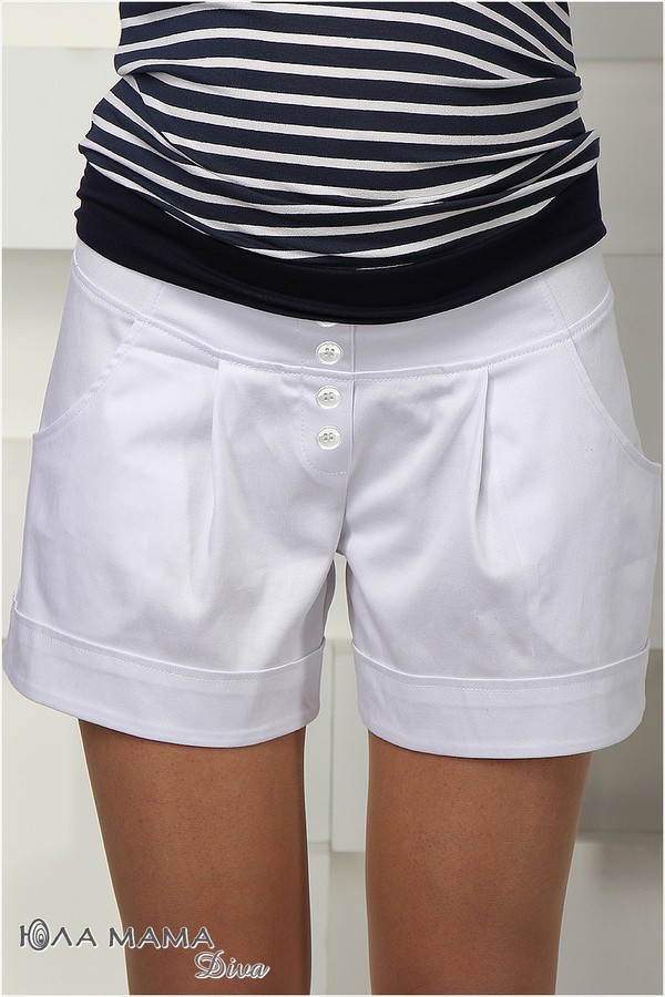 Широкие шорты из стрейч-коттона средней длины, с подворотами. Впереди от пояса вниз складки и карманы со свободным облеганием. Универсальный бандажный пояс с широкими шлевками. Цвет: белый.